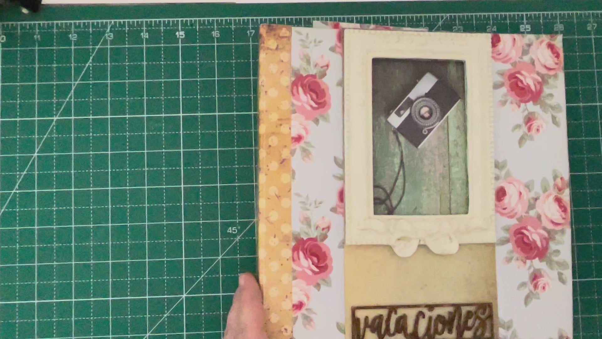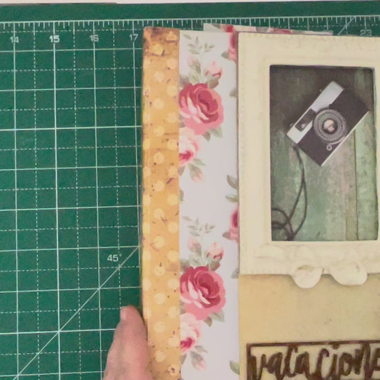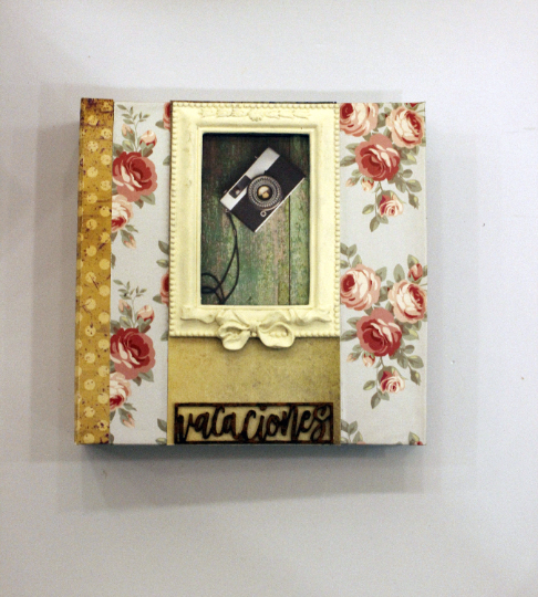 La portada esta realizada con papeles de la colección, se ha usado un marquito de primma Marketing y la maderita de vacaciones.